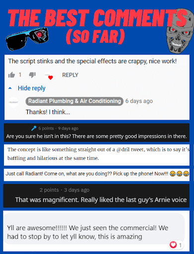 Needless to say, our most recent commercial has made quite a splash, with critics calling it “a sci-fi masterpiece” and “deranged.” Our favorite piece came courtesy of The AV Club writing: “Radiant Plumbing & Air Conditioning is working on a level that transcends linear storytelling or easily-discernible themes.” After four short weeks, the commercial’s extended version has surpassed the 100K view count on Youtube, and it has been shared endlessly by hordes of rabid fans. They love toilet humor as much as we do and they want the world to know. But most importantly, they want Arnold to know. Over the last four weeks, Mr. Schwarzenegger’s publicist has been treated to ‘at tags’ and mentions well into the hundreds. As of yet, to no avail. But more on that later. First, let’s check some of the best comments.