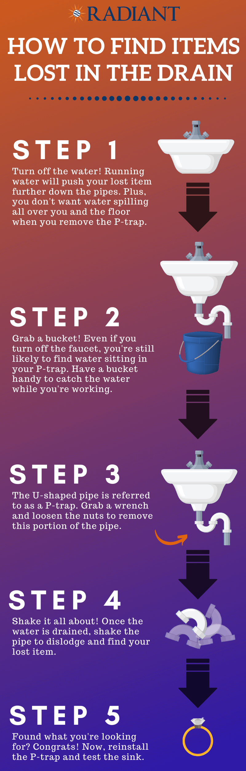 Click on the image below to get a detailed approach on how to get into your drains and retrieve that unlucky item. And if managing your p-trap or removing your drain sounds too tough, call the experts at Radiant Plumbing and Air – we’ve got your back!